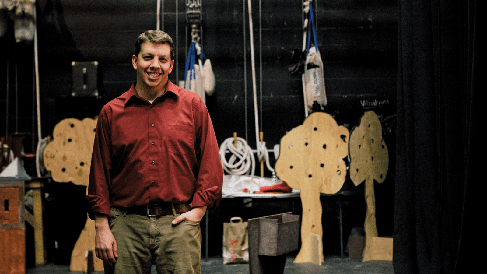 When the Williston Theater staged The Laramie Project in October 2018, set designer and technical theater teacher Charles Raffetto employed the technology known as projection mapping to display video precisely within the outline of a town map of Laramie, Wyoming. For the production of Into the Woods that spring, he used the technology to project custom-rendered images onto irregular shaped panels as they moved across the stage.