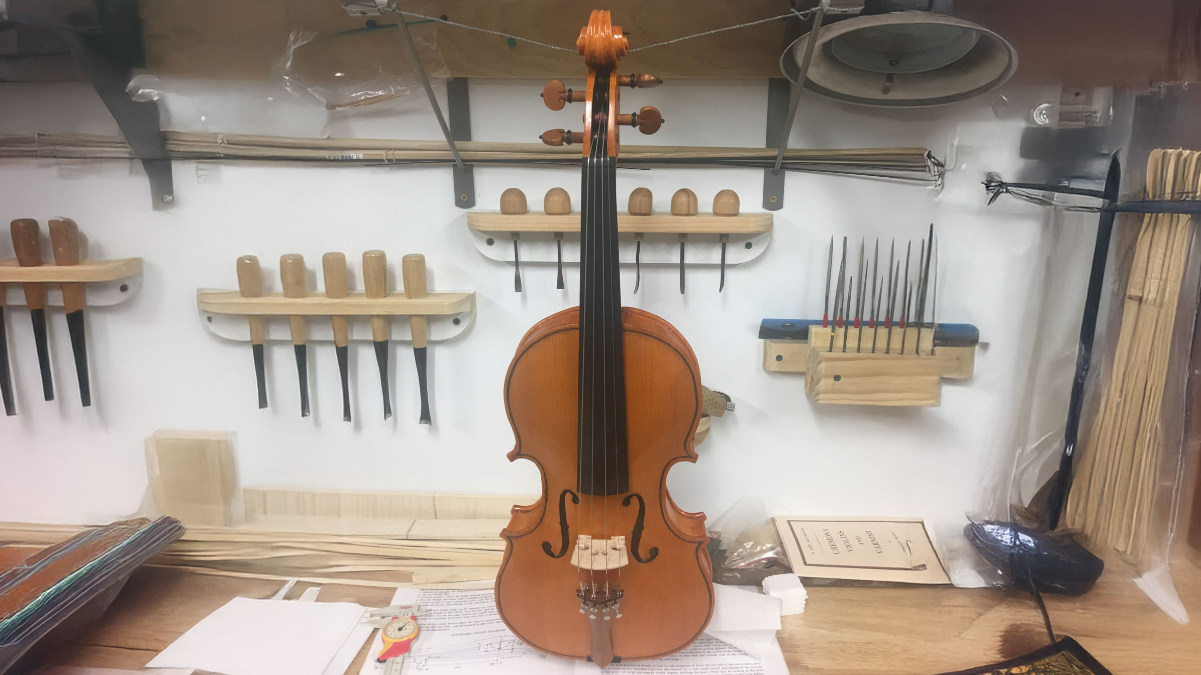 Sadly, Bittner was never able to play the instrument. Diagnosed with ALS, she died in 2016. But before she died, a musician who was visiting her at her nursing home did play the instrument. “He said, ‘Hey, this isn’t so bad,’” Hawkes recalls. So Hawkes kept making them. “For a while there I was making two or three a year,” he says. “Everything I do is from scratch,” he says of the careful and painstaking construction process, which ends with 25 coats of varnish, each of which takes days to dry. When each instrument was complete, Hawkes would send it to the music school, along with money for one child’s music lessons.