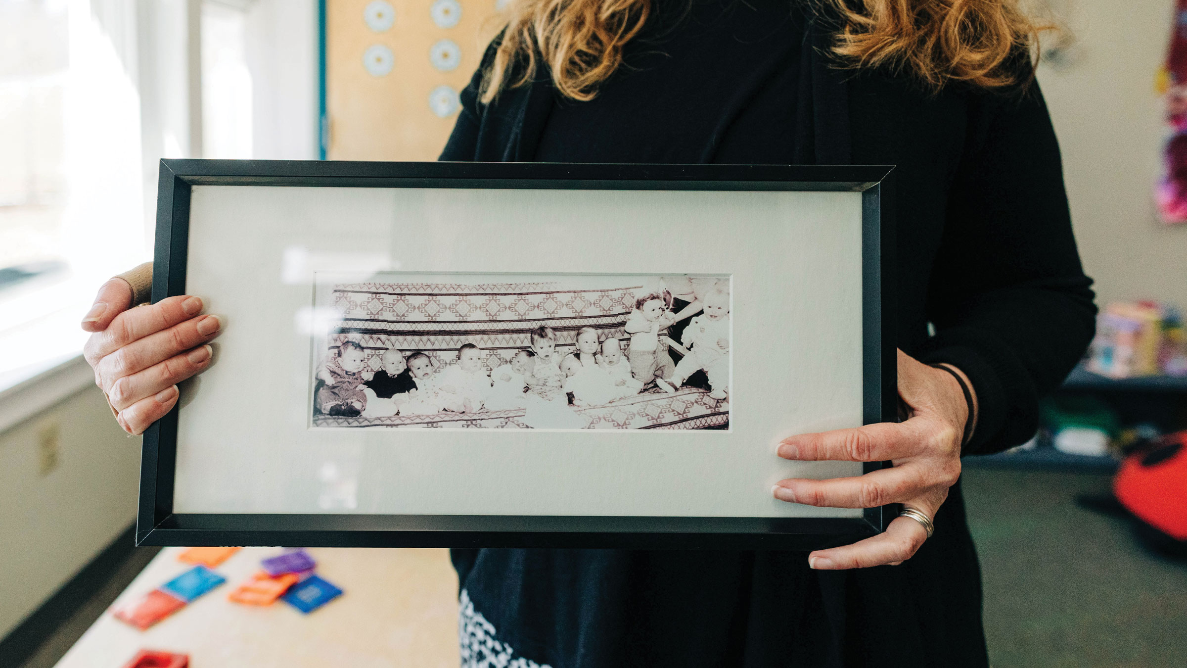 Durrett holds a photo of the first “class” at the Children’s Center—a faculty baby boom that sparked the center’s founding in 1999