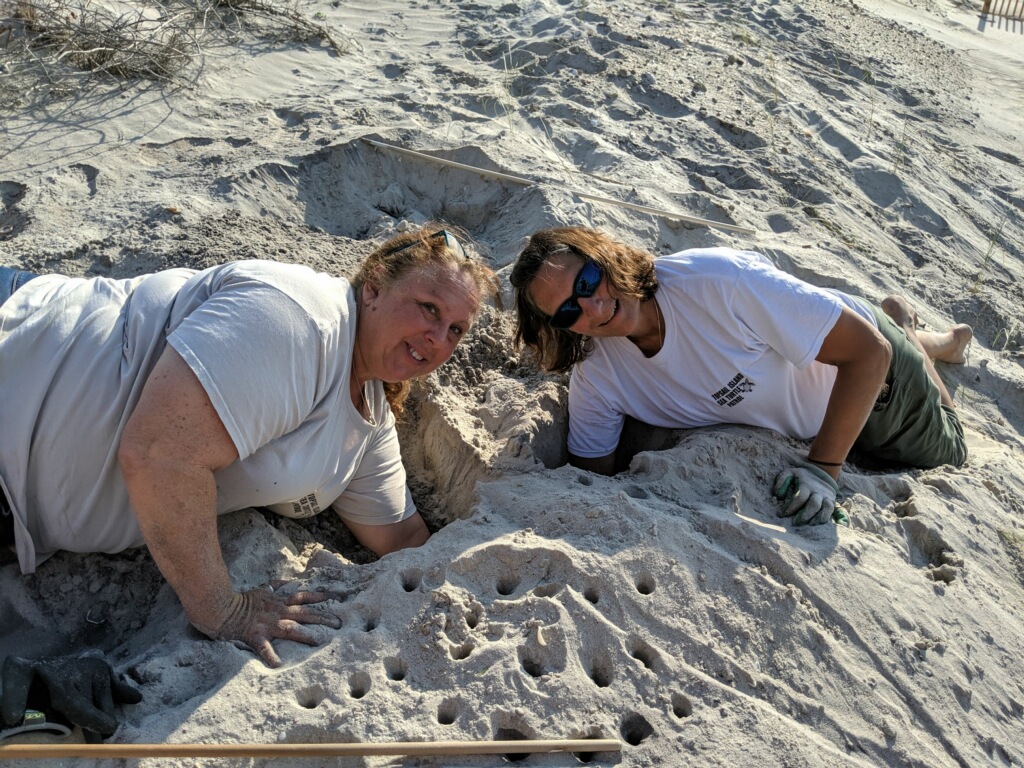 Yes. When we get a call that there are tracks, we head out. If we find a nest, we remove one egg to send to the University of Georgia—they’ve been doing DNA studies on sea turtles since 2010—then we cover up the rest and mark the site with stakes. Sometimes we find a nest that’s too close to the water and have to move it first, so it won’t wash out. We put wire over all the nests to keep predators out and add signs from the North Carolina Wildlife Resources Commission that say, basically, “Don’t mess with this nest.” You can get fined and even prison time for disturbing sea turtles because they’re protected by the Endangered Species Act.