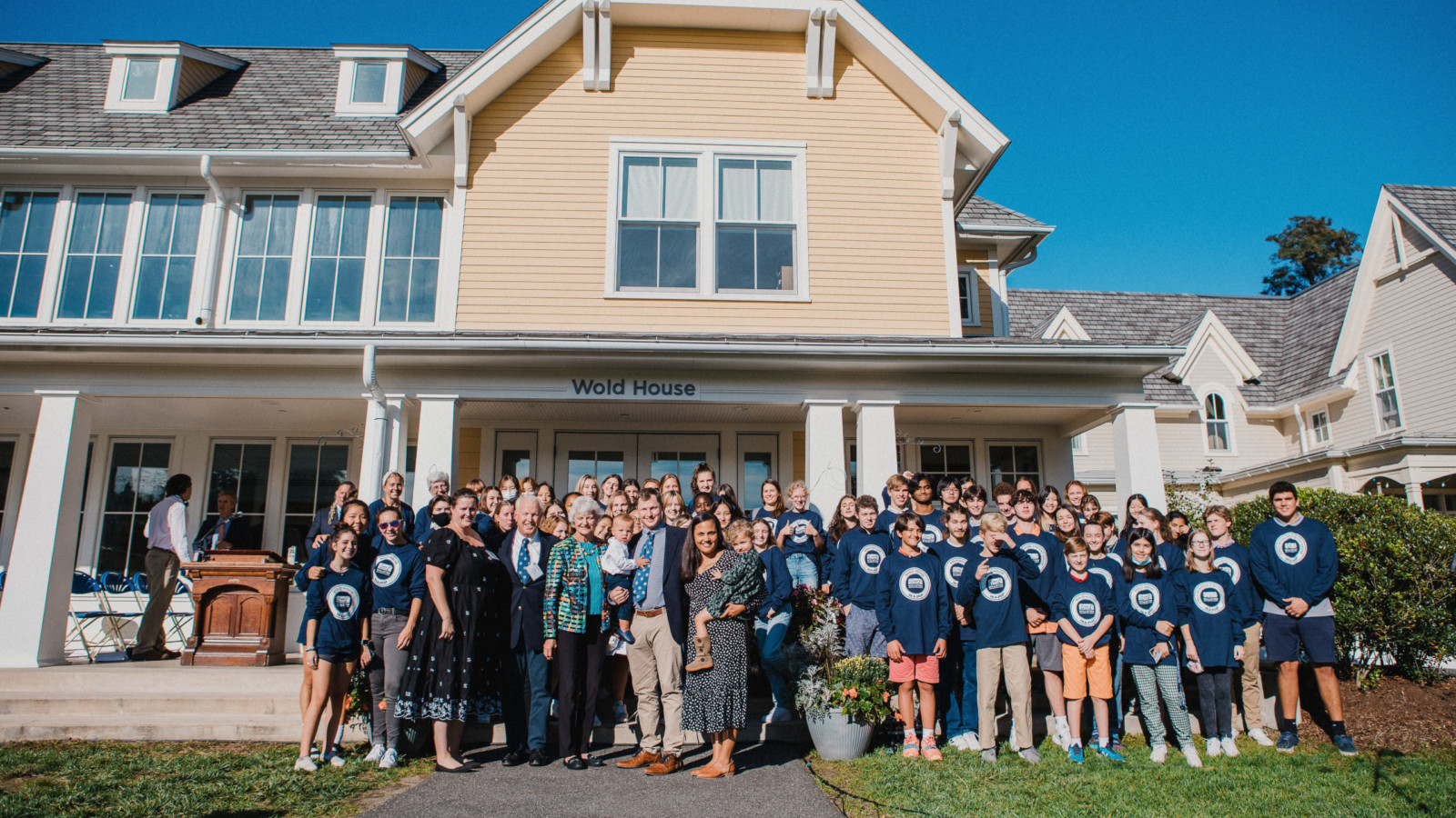 On October 8, 2021, the Williston Northampton School community gathered to dedicate Emily McFadon Vincent House and Wold House, thereby completing the Residential Quadrangle. On this warm and sunny day, members of the Board of Trustees were on hand to mark the occasion, as was the entire student body, dressed in navy blue T-shirts with the logos of the two residence halls.